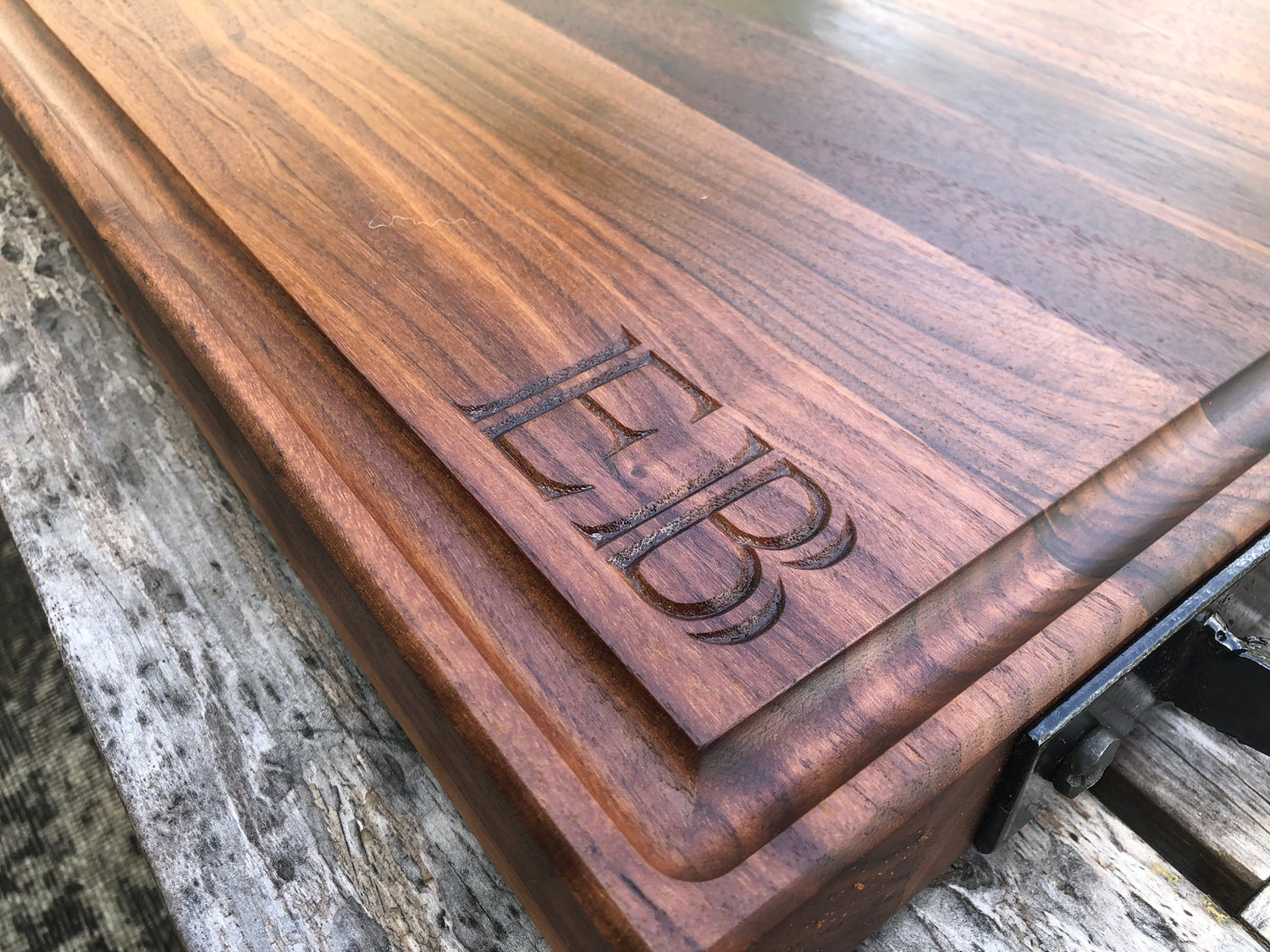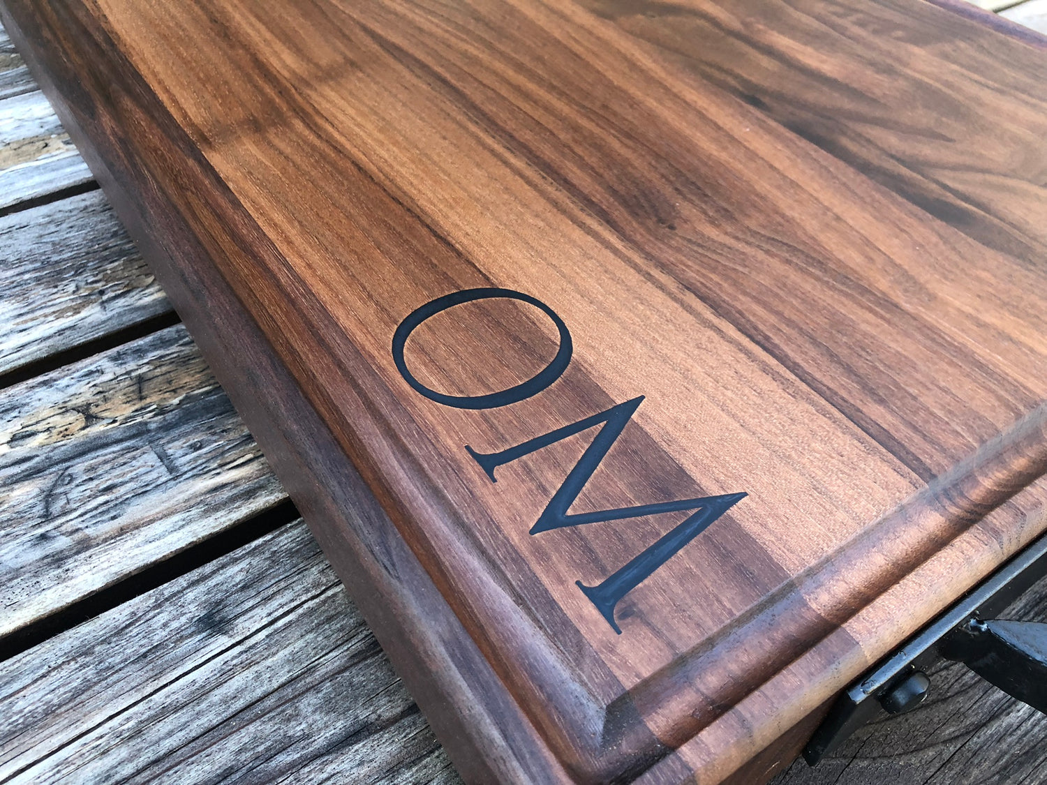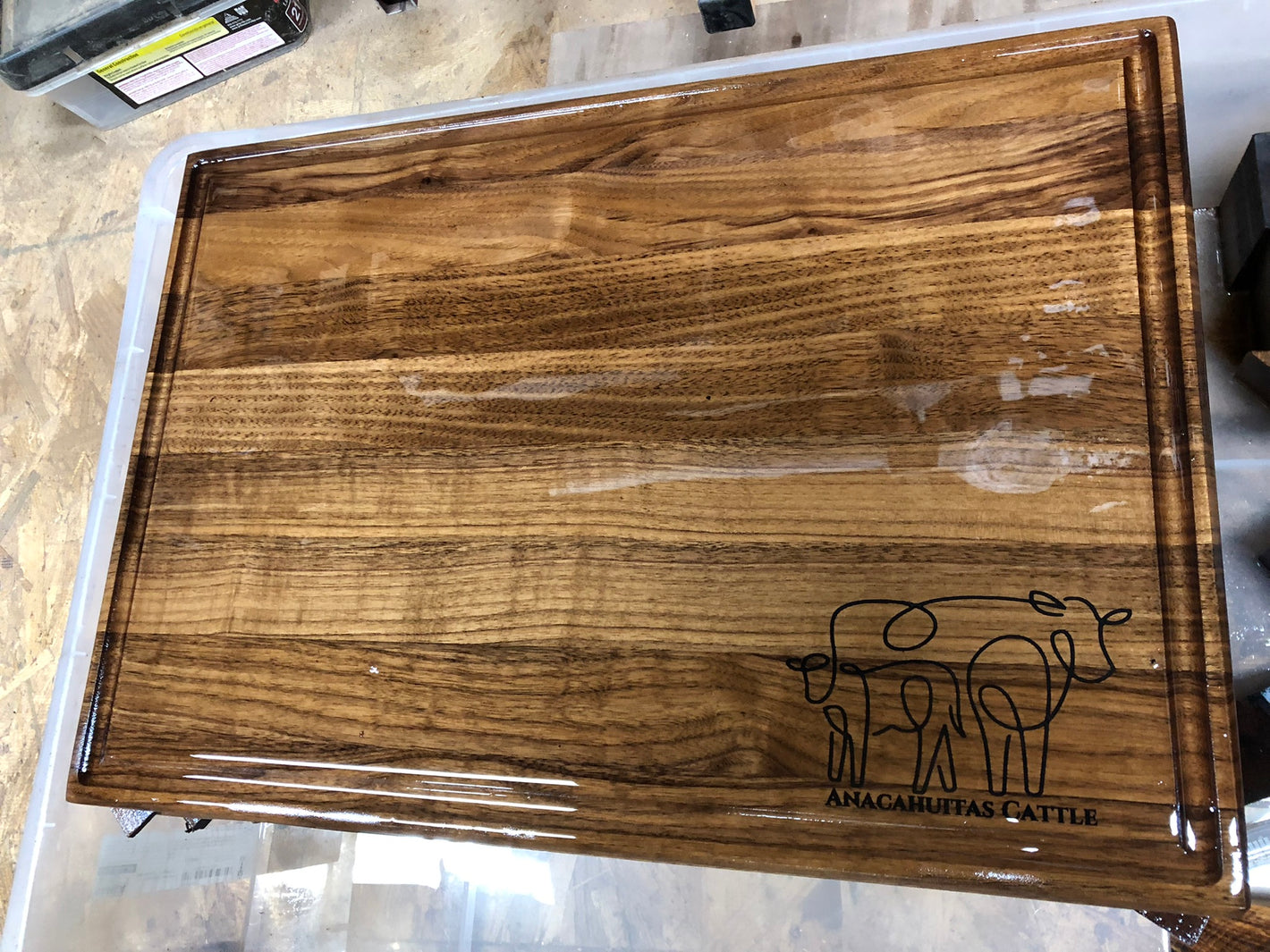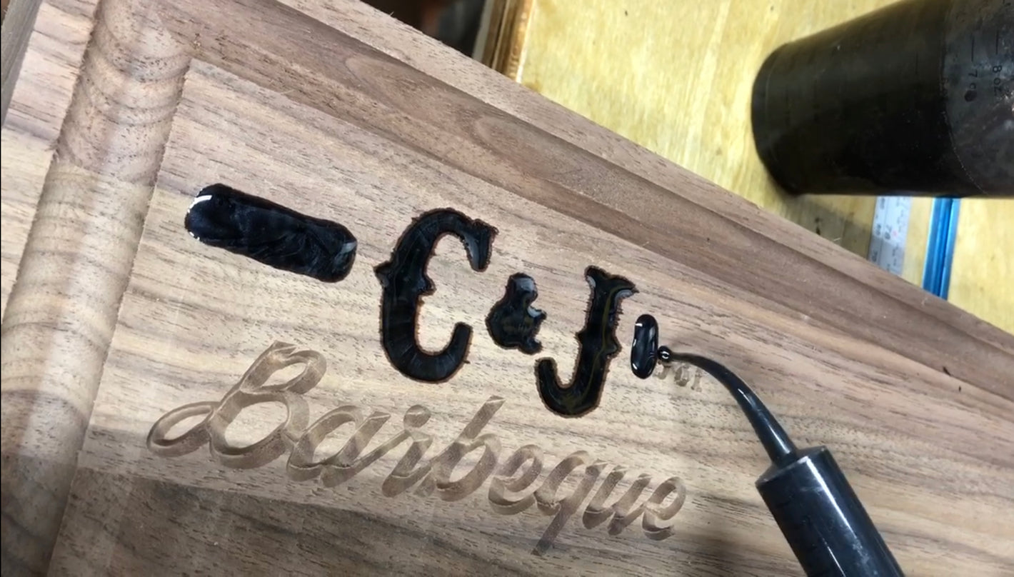 Once the Initials / logo are CNC carved, we can fill them with Black Epoxy. Epoxy has a curation process that hardens once it is complete. The fully cured epoxy is food contact safe (FDA Compliant).