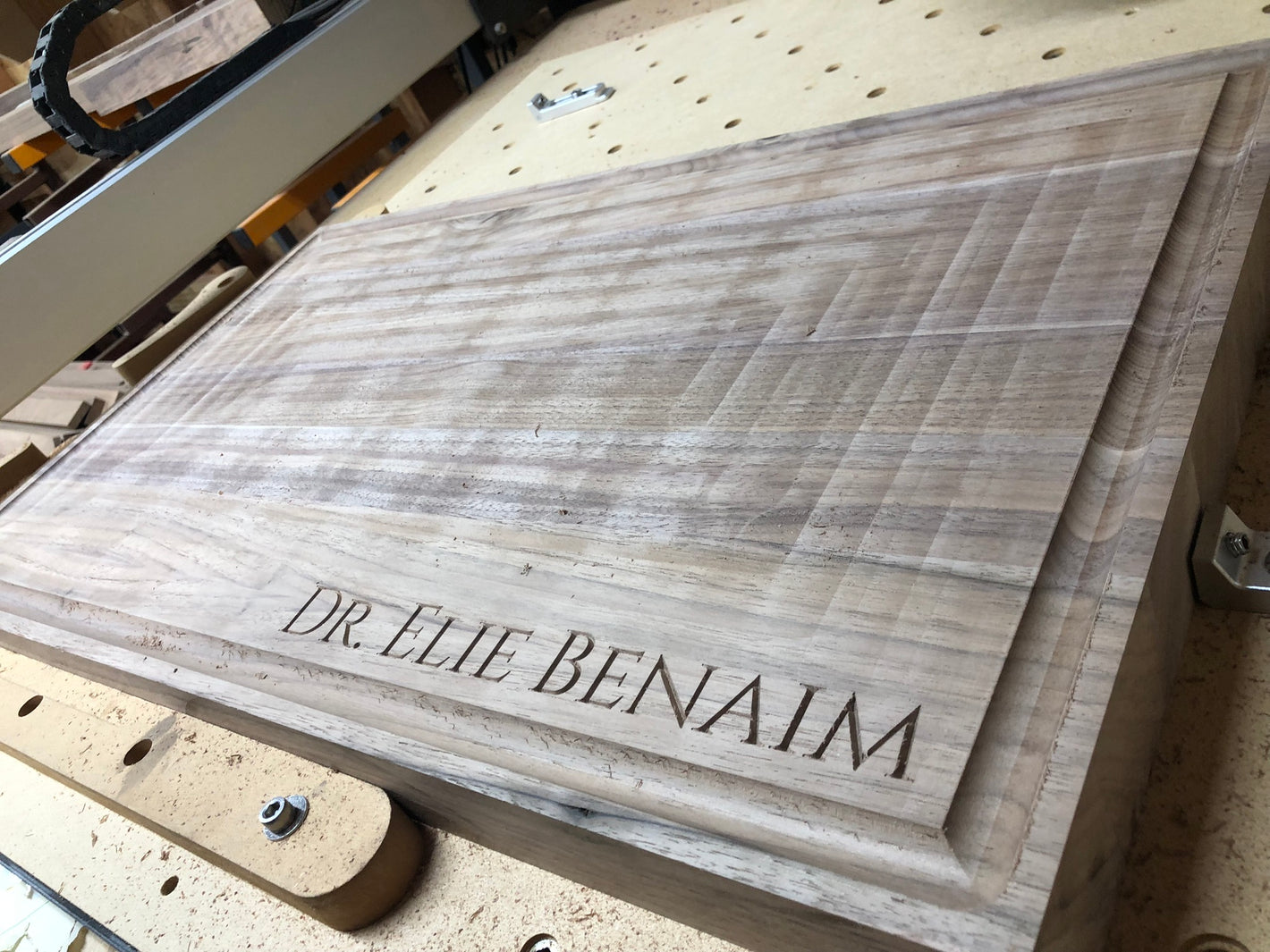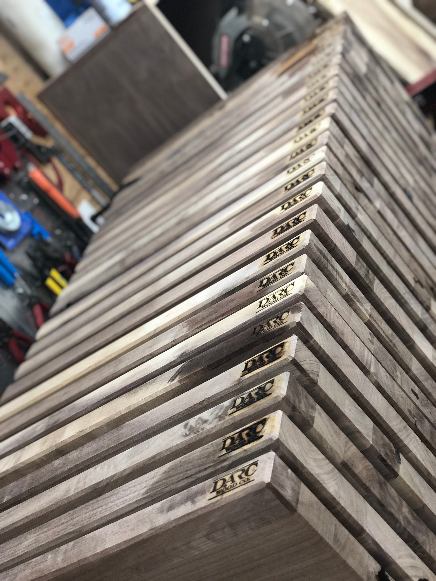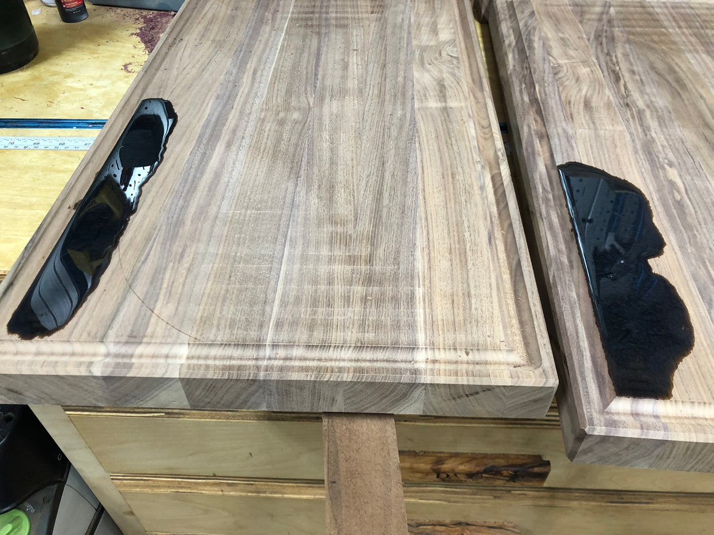 Once the Initials / logo are CNC carved, we can fill them with Black Epoxy. Epoxy has a curation process that hardens once it is complete. The fully cured epoxy is food contact safe (FDA Compliant).