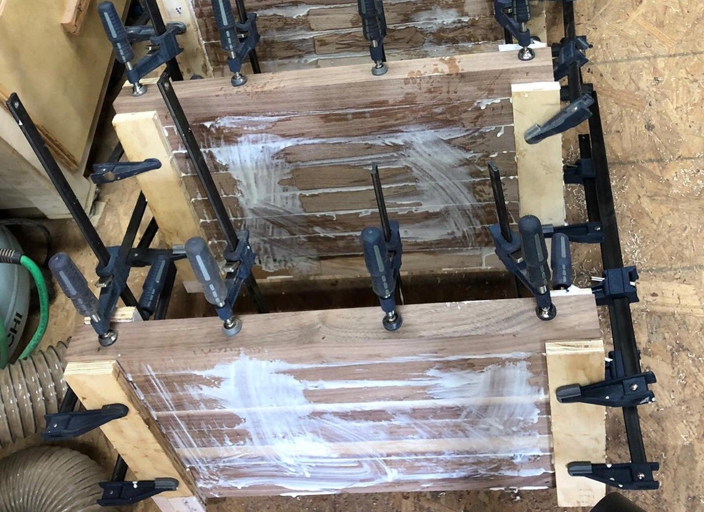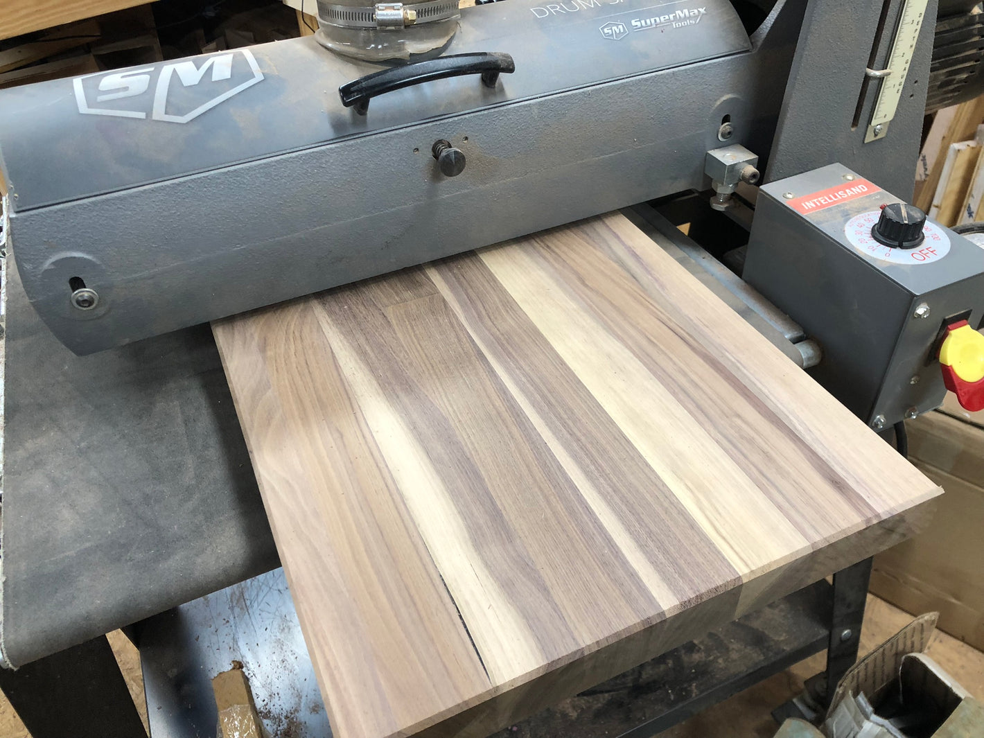 8.) After 24 hours of glue curing time, we unclamp the boards and run these through drum sander to re-flatten.