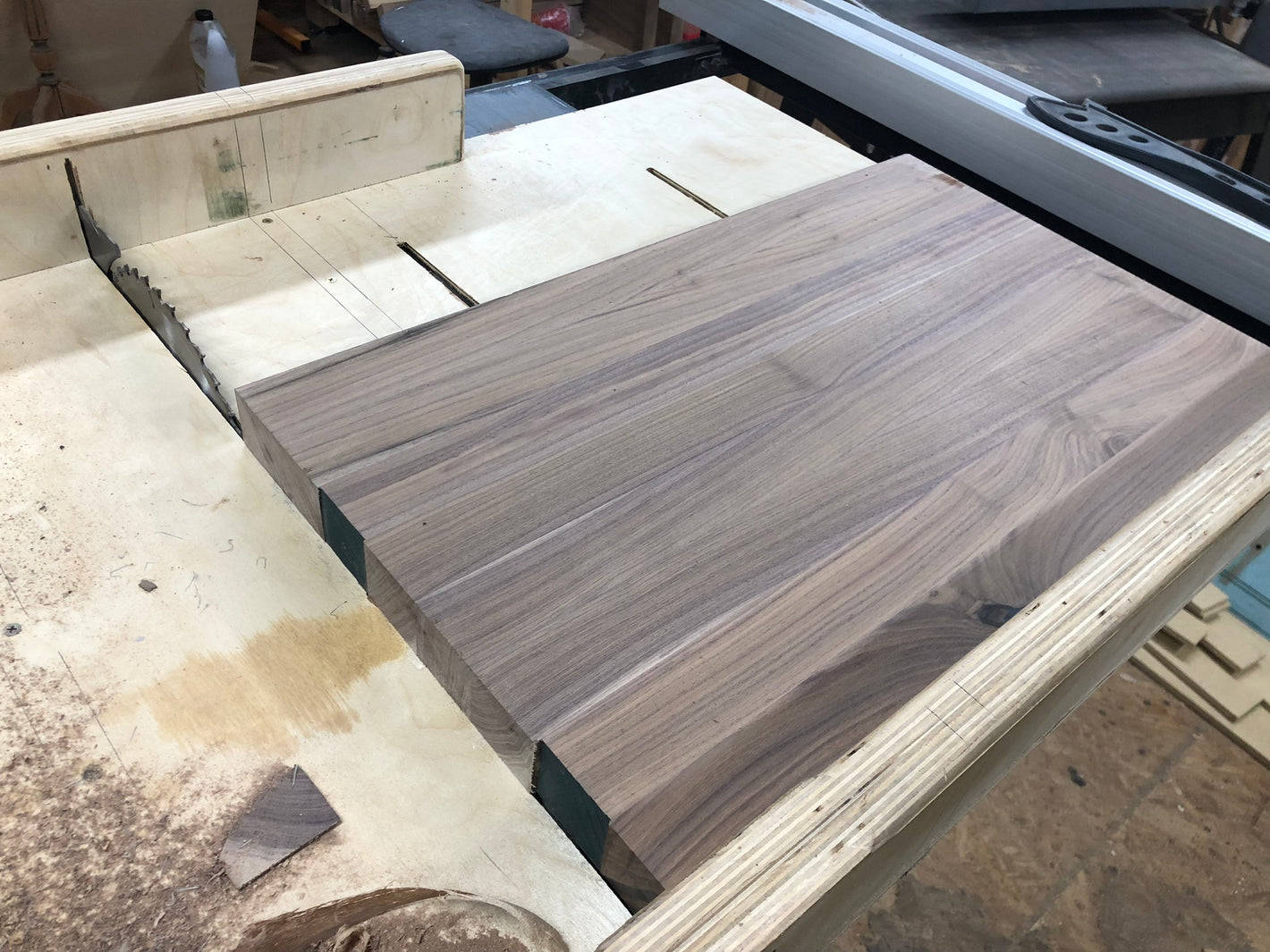 9.) Once a rough surfacing is complete in the drum sander, then we proceed with cutting all 4 sides square using a cutting sled jig.